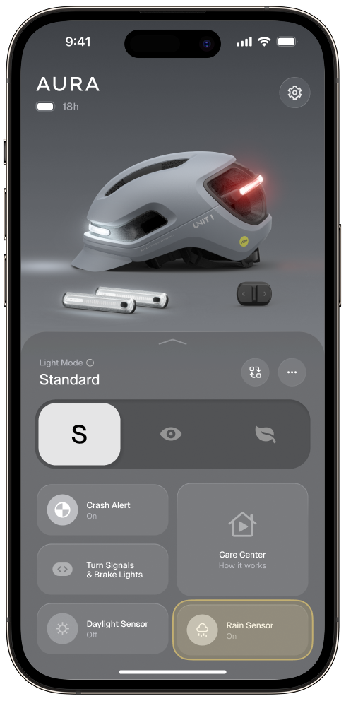 Rain Sensor helps boost visibility in low-visibility weather (rain, snow, mist, etc.) by making your helmet lights brighter and adding a strobing effect.